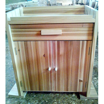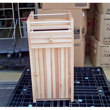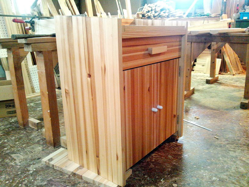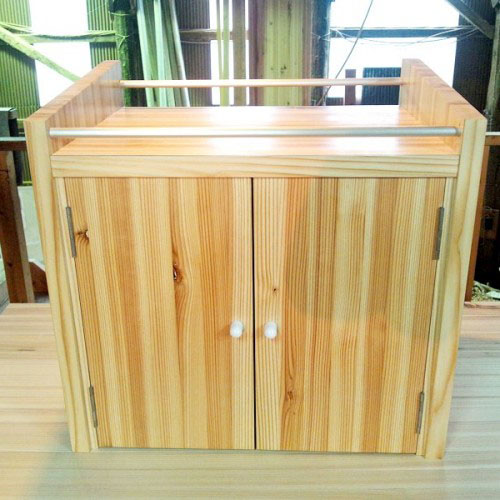 国産杉材の積層材で作りました。木肌が温かく丈夫です。金属の丸棒を使い丈夫でオシャレに仕上げました。裏面は、ポンプの熱がこもらない様に大きな開口を付けています。いろんなサイズで製作しています。扉の有る・無し・引出しの物入れも製作出来ます。