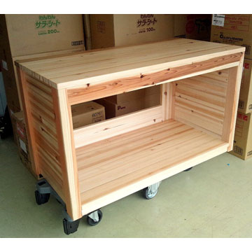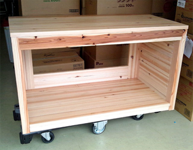 杉の角材と杉の積層板を合わせて丈夫な水槽台を作りました。水槽を二段に置く事も出来ますが下にポンプなどの器具を仕舞う事藻できます。水槽の重量を受ける角材を台の上部前後に入れています。重量がある水槽を置く台に良いと思います。
